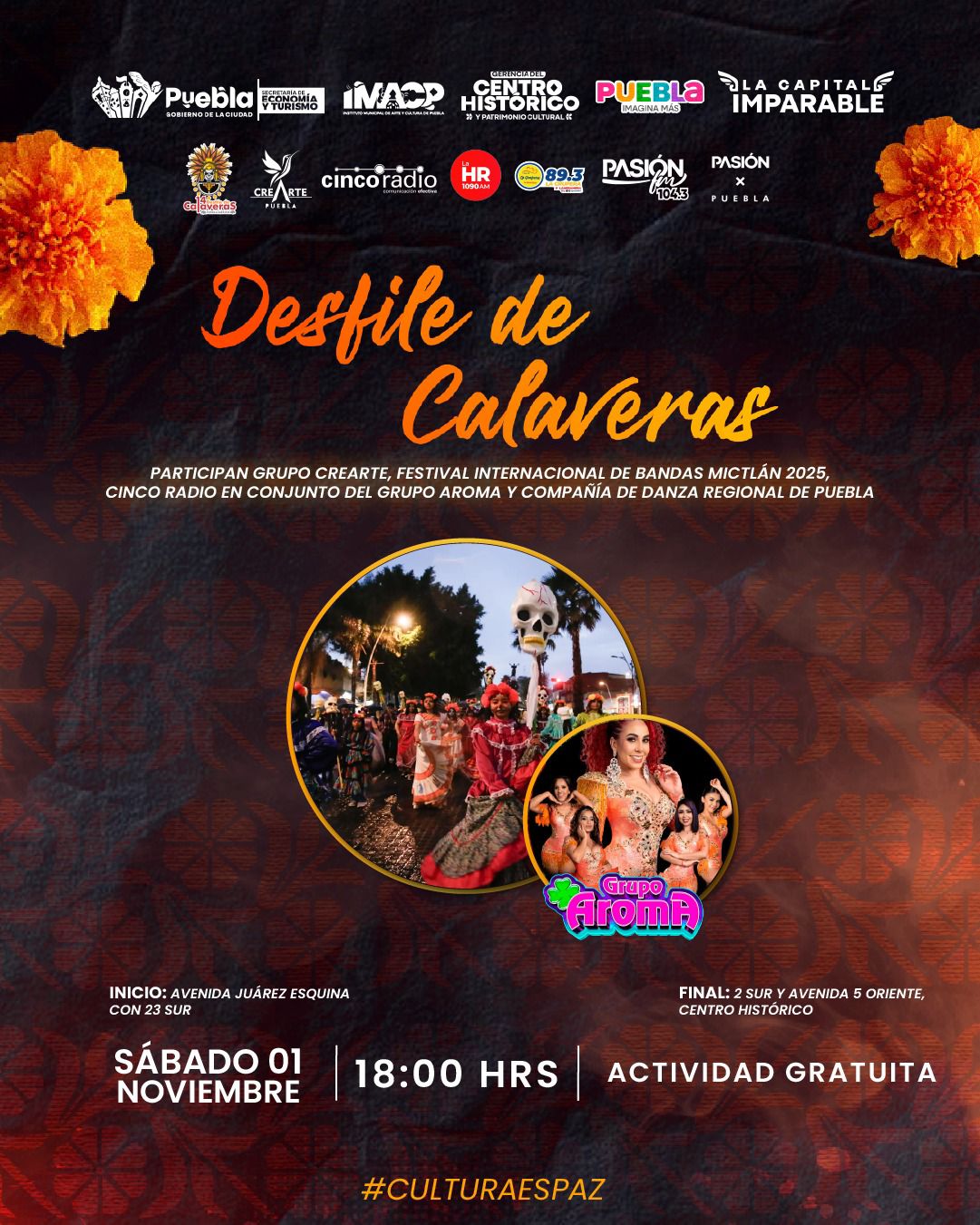El gobierno municipal, encabezado por el alcalde José Chedraui Budib, a través del Instituto Municipal de Arte y Cultura de Puebla (IMACP) que dirige Anel Nochebuena, y en coordinación con Crearte, invitan a la ciudadanía a disfrutar este 1 de noviembre del XIV Desfile de Calaveras, evento emblemático del Festival “La Muerte es un Sueño”.