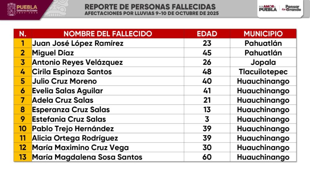 En el municipio de Pahuatlán, las víctimas fueron Juan José López Ramírez y Miguel Díaz. Asimismo, se reportó el fallecimiento de Antonio Reyes en Jopala y Cirila Espinoza Santos en Tlacuilotepec. Por otra parte, también en Huauchinango continúan las labores de búsqueda de Lázaro Gayosso Rodríguez, Celeste Barrios y el menor Liam Tadeo González Lechuga. En el municipio de Tetela de Ocampo, aún no ha sido localizado Pedro Segura Muñoz.