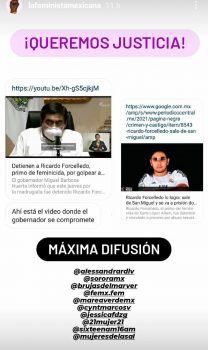 “Fui víctima de Ricardo Forcelledo que es primo del feminicida Manuel Forcelledo, Ricardo ha podido comprar a las autoridades y le dieron prisión domiciliaria, pero tenemos miedo porque ha seguido amenazando y parece que no hay justicia a pesar de haber puesto denuncias”, se lee en un mensaje.