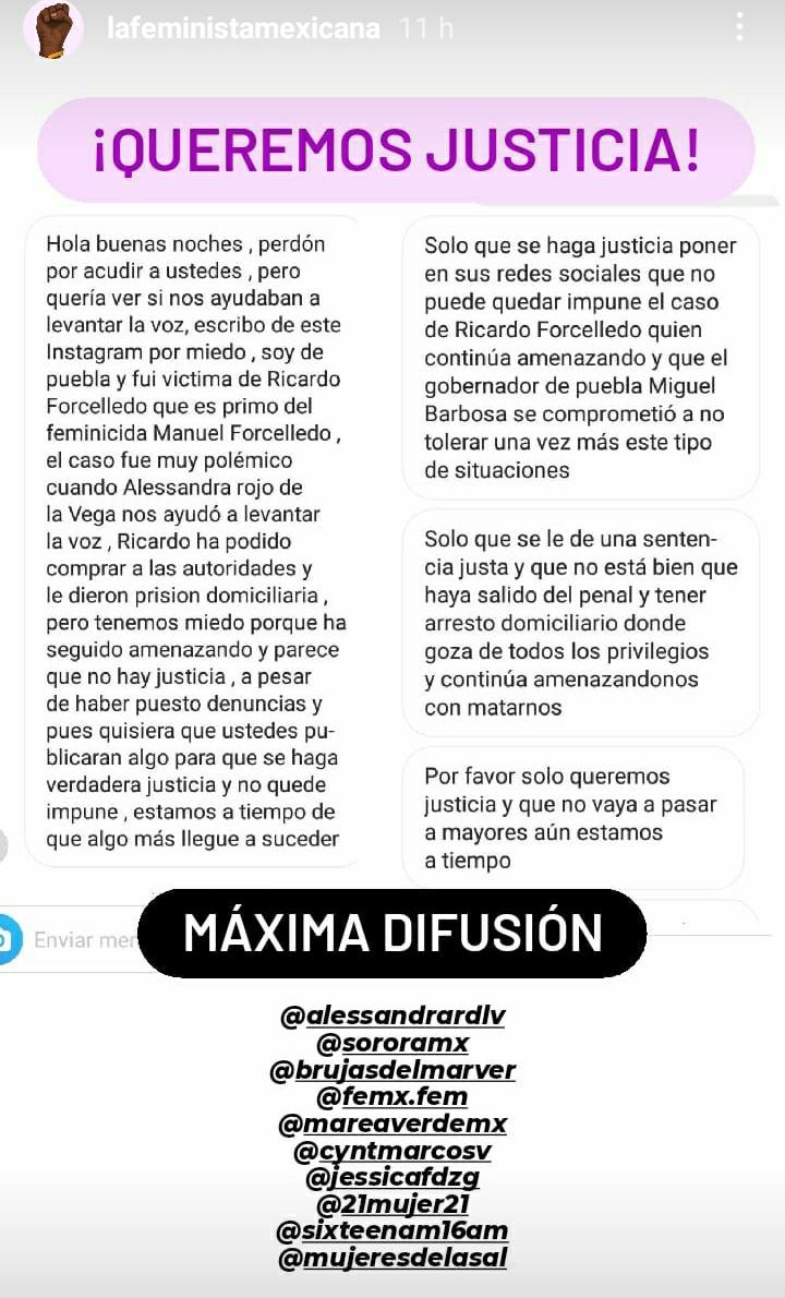“Fui víctima de Ricardo Forcelledo que es primo del feminicida Manuel Forcelledo, Ricardo ha podido comprar a las autoridades y le dieron prisión domiciliaria, pero tenemos miedo porque ha seguido amenazando y parece que no hay justicia a pesar de haber puesto denuncias”, se lee en un mensaje.