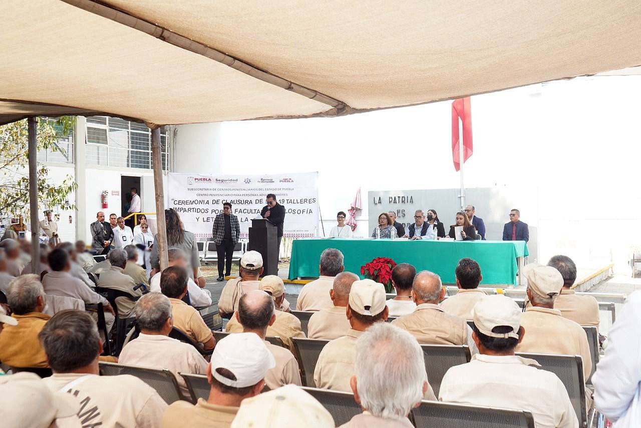 Como parte de las acciones que el Gobierno de Puebla impulsa para una reinserción social con enfoque inclusivo, la Secretaría de Seguridad Pública (SSP) y la Benemérita Universidad Autónoma de Puebla (BUAP) realizaron la clausura de talleres en el Centro Penitenciario para Personas Adultas Mayores.