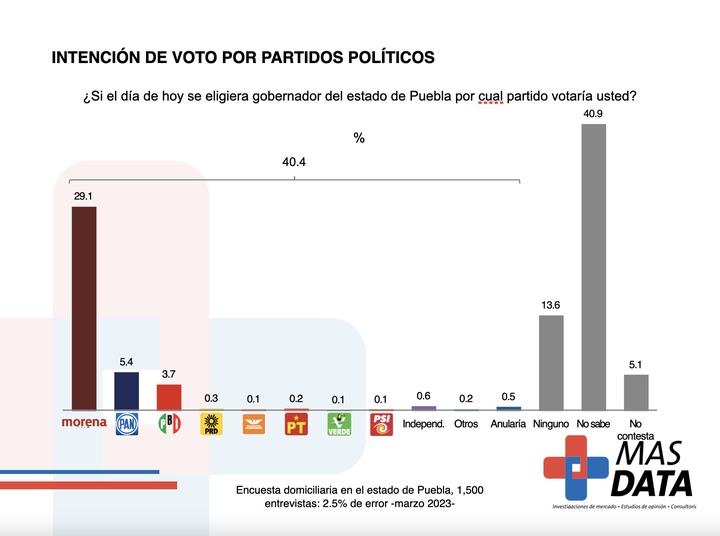Así lo dio a conocer la más reciente encuesta de MAS DATA, empresa encuestadora que mostró resultados en los que el 29.1 por ciento de los poblanos elegirían un gobierno de Morena y tan sólo el 9.4 por ciento aceptaría al otro bloque partidista.