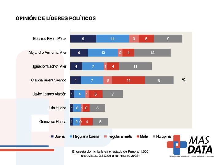 El senador de Morena, Alejandro Armenta, quien trae mayor conocimiento y recorrido desde años atrás por la entidad mantiene sus mismos números: 33 por ciento de conocimiento por debajo de Claudia Rivera quien tiene un 34 por ciento. Cabe mencionar, que este nivel de conocimiento se debe a que fue alcaldesa de Puebla; sin embargo, eso no implica que la gente quiera votar por ella, pues sus negativos son considerables: obtuvo seis respuestas positivas y 16 negativas.